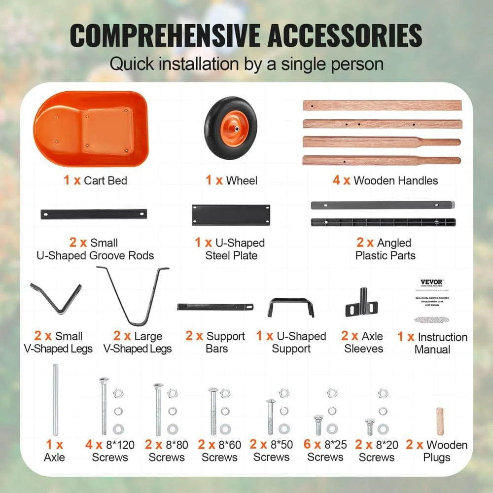 - Package content: 1 x instruction manual, 1 x cart bed, 4 x wooden handles, 2 x angled plastic parts, 1 x u-shaped steel plate, 2 x support bars, 1 x axle, 2 x small V-shaped legs, 2 x large V-shaped legs, 2 x axle sleeves, 1 x u-shaped support, 2 x small u-shaped groove rods,1 x wheel, 2 x wooden plugs, screws: 2 x (8 x 120), 4 x (8 x 70), 2 x (8 x 45), 6 x (8 x 22), 2 x (8 x 20), 2 x (8 x 80)